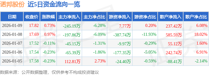 证券之星消息,截至2026年1月9日收盘,诺邦股份(603238)报收于17.82元,上涨0.73%,换手率1.24%,成交量2.21万手,成交额3905.69万元。