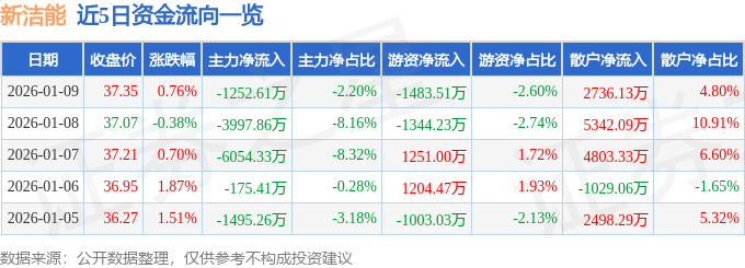 1月9日的资金流向数据方面,主力资金净流出1252.61万元,占总成交额2.2%,游资资金净流出1483.51万元,占总成交额2.6%,散户资金净流入2736.13万元,占总成交额4.8%。