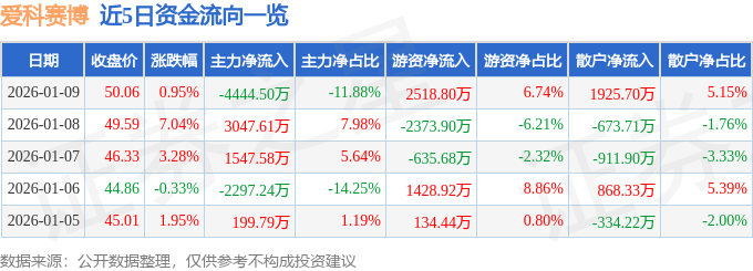 1月9日的资金流向数据方面,主力资金净流出4444.5万元,占总成交额11.88%,游资资金净流入2518.8万元,占总成交额6.74%,散户资金净流入1925.7万元,占总成交额5.15%。