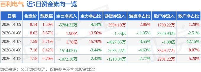 证券之星消息,截至2026年1月9日收盘,百利电气(600468)报收于8.14元,上涨1.5%,换手率15.88%,成交量172.77万手,成交额13.97亿元。
