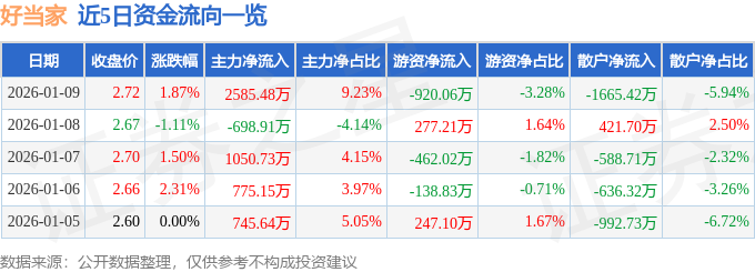 证券之星消息,截至2026年1月9日收盘,好当家(600467)报收于2.72元,上涨1.87%,换手率7.1%,成交量103.74万手,成交额2.8亿元。
