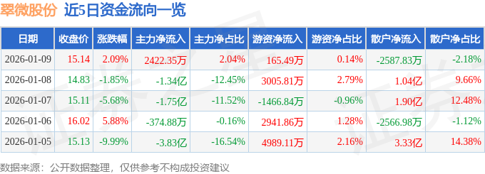 1月9日的资金流向数据方面,主力资金净流入2422.35万元,占总成交额2.04%,游资资金净流入165.49万元,占总成交额0.14%,散户资金净流出2587.83万元,占总成交额2.18%。