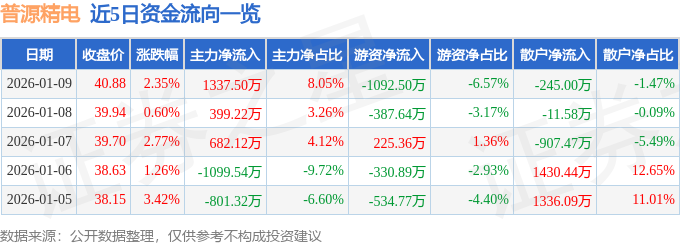 1月9日的资金流向数据方面,主力资金净流入1337.5万元,占总成交额8.05%,游资资金净流出1092.5万元,占总成交额6.57%,散户资金净流出245.0万元,占总成交额1.47%。