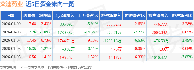 证券之星消息,截至2026年1月9日收盘,艾迪药业(688488)报收于17.68元,上涨2.43%,换手率1.87%,成交量7.85万手,成交额1.36亿元。
