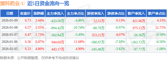 证券之星消息,截至2026年1月9日收盘,盟科药业(688373)报收于6.73元,上涨2.44%,换手率2.42%,成交量14.61万手,成交额9720.78万元。