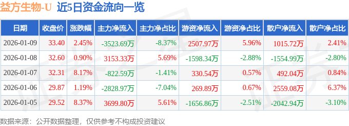 证券之星消息,截至2026年1月9日收盘,益方生物(688382)报收于33.4元,上涨2.45%,换手率3.08%,成交量12.87万手,成交额4.21亿元。