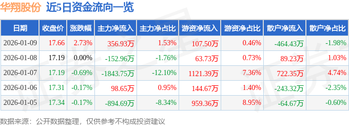 证券之星消息,截至2026年1月9日收盘,华翔股份(603112)报收于17.66元,上涨2.73%,换手率2.61%,成交量13.16万手,成交额2.34亿元。