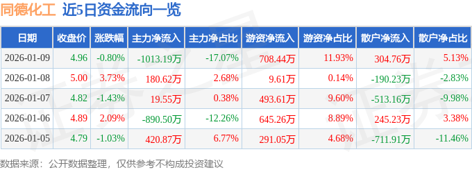 证券之星消息,截至2026年1月9日收盘,同德化工(002360)报收于4.96元,下跌0.8%,换手率3.64%,成交量11.93万手,成交额5935.91万元。