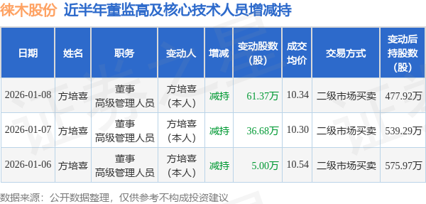 证券之星消息,根据1月9日市场公开信息、上市公司公告及交易所披露数据整理,徕木股份(603633)最新董监高及相关人员股份变动情况:2026年1月8日公司董事,高级管理人员方培喜共减持公司股份61.37万股,占公司总股本为0.1438%。变动期间公司股价上涨0.0%,1月8日当日收盘报10.28元。