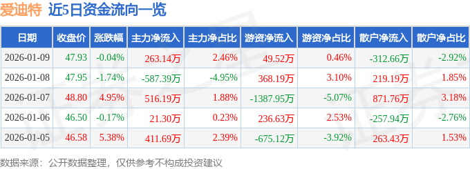 证券之星消息,截至2026年1月9日收盘,爱迪特(301580)报收于47.93元,下跌0.04%,换手率3.11%,成交量2.24万手,成交额1.07亿元。