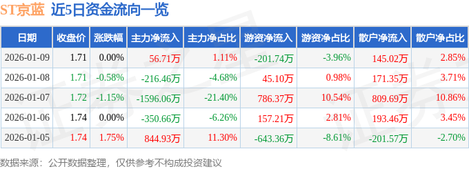 证券之星消息,截至2026年1月9日收盘,ST京蓝(000711)报收于1.71元,上涨0.0%,换手率1.3%,成交量29.74万手,成交额5088.69万元。