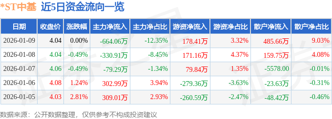 证券之星消息,截至2026年1月9日收盘,*ST中基(000972)报收于4.04元,上涨0.0%,换手率1.74%,成交量13.43万手,成交额5376.4万元。