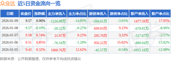 1月9日的资金流向数据方面,主力资金净流出1216.98万元,占总成交额14.05%,游资资金净流出260.61万元,占总成交额3.01%,散户资金净流入1477.59万元,占总成交额17.05%。