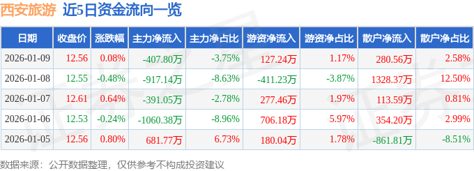 证券之星消息,截至2026年1月9日收盘,西安旅游(000610)报收于12.56元,上涨0.08%,换手率3.69%,成交量8.68万手,成交额1.09亿元。