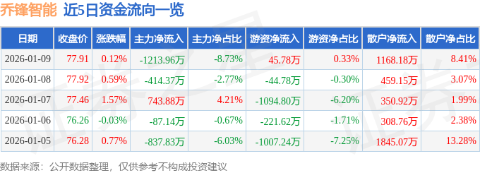 证券之星消息,截至2026年1月9日收盘,乔锋智能(301603)报收于77.91元,上涨0.12%,换手率4.75%,成交量1.79万手,成交额1.39亿元。
