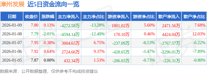 证券之星消息,截至2026年1月9日收盘,漳州发展(000753)报收于7.8元,上涨0.13%,换手率4.14%,成交量41.03万手,成交额3.22亿元。