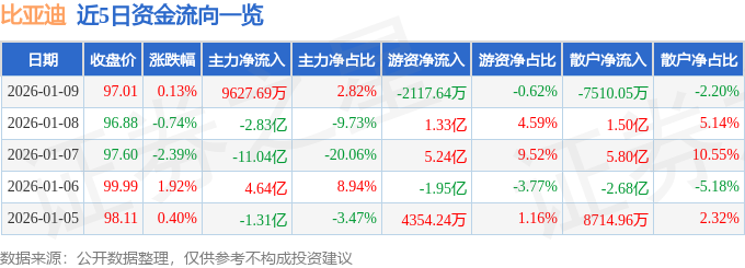 证券之星消息,截至2026年1月9日收盘,比亚迪(002594)报收于97.01元,上涨0.13%,换手率1.0%,成交量35.03万手,成交额34.13亿元。