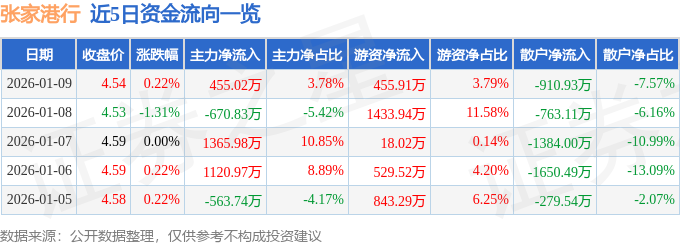 证券之星消息,截至2026年1月9日收盘,张家港行(002839)报收于4.54元,上涨0.22%,换手率1.09%,成交量26.65万手,成交额1.2亿元。