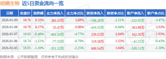 证券之星消息,截至2026年1月9日收盘,明德生物(002932)报收于18.76元,上涨0.32%,换手率2.3%,成交量3.59万手,成交额6706.4万元。