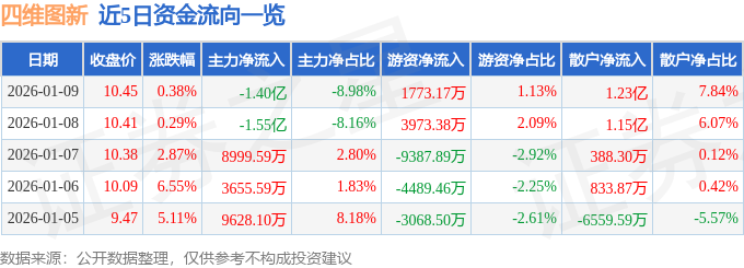 1月9日的资金流向数据方面,主力资金净流出1.4亿元,占总成交额8.98%,游资资金净流入1773.17万元,占总成交额1.13%,散户资金净流入1.23亿元,占总成交额7.84%。