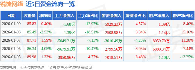 证券之星消息,截至2026年1月9日收盘,锐捷网络(301165)报收于85.83元,上涨0.4%,换手率1.95%,成交量15.48万手,成交额12.98亿元。