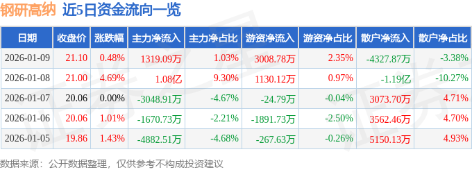 证券之星消息,截至2026年1月9日收盘,钢研高纳(300034)报收于21.1元,上涨0.48%,换手率7.86%,成交量60.24万手,成交额12.79亿元。