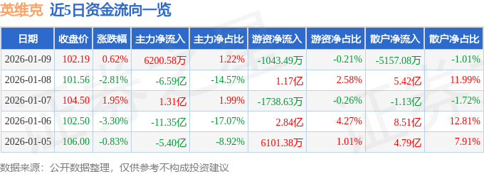 证券之星消息,截至2026年1月9日收盘,英维克(002837)报收于102.19元,上涨0.62%,换手率5.88%,成交量49.98万手,成交额50.87亿元。