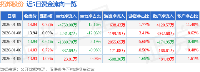 1月9日的资金流向数据方面,主力资金净流出4759.0万元,占总成交额13.16%,游资资金净流入638.43万元,占总成交额1.77%,散户资金净流入4120.57万元,占总成交额11.4%。