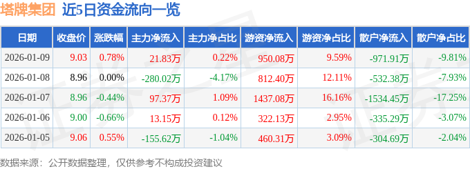 证券之星消息,截至2026年1月9日收盘,塔牌集团(002233)报收于9.03元,上涨0.78%,换手率0.92%,成交量11.0万手,成交额9910.13万元。