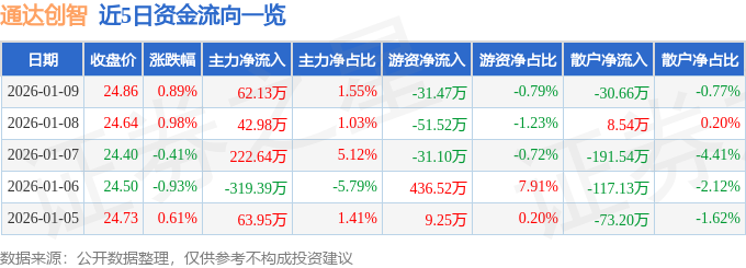 证券之星消息,截至2026年1月9日收盘,通达创智(001368)报收于24.86元,上涨0.89%,换手率5.05%,成交量1.62万手,成交额3999.46万元。