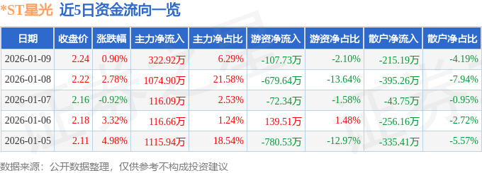证券之星消息,截至2026年1月9日收盘,*ST星光(002076)报收于2.24元,上涨0.9%,换手率2.22%,成交量23.13万手,成交额5134.3万元。