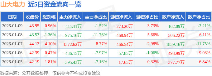 证券之星消息,截至2026年1月9日收盘,山大电力(301609)报收于43.95元,上涨0.96%,换手率4.83%,成交量1.68万手,成交额7326.62万元。