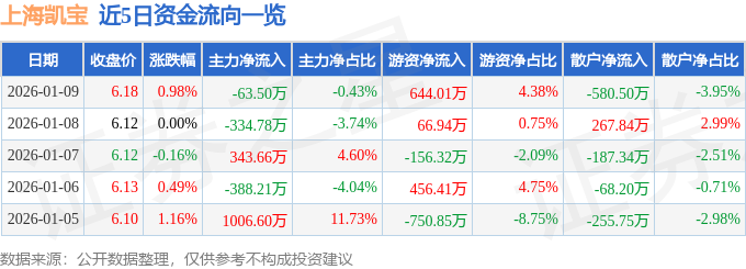 证券之星消息,截至2026年1月9日收盘,上海凯宝(300039)报收于6.18元,上涨0.98%,换手率2.61%,成交量23.91万手,成交额1.47亿元。