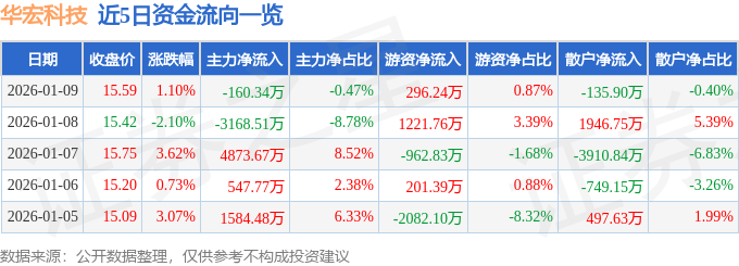 证券之星消息,截至2026年1月9日收盘,华宏科技(002645)报收于15.59元,上涨1.1%,换手率3.91%,成交量21.85万手,成交额3.41亿元。