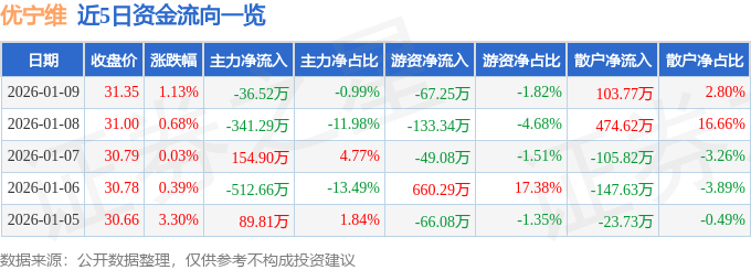 证券之星消息,截至2026年1月9日收盘,优宁维(301166)报收于31.35元,上涨1.13%,换手率2.09%,成交量1.19万手,成交额3703.02万元。