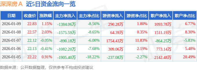 证券之星消息,截至2026年1月9日收盘,深深房A(000029)报收于22.83元,上涨1.15%,换手率0.8%,成交量7.14万手,成交额1.62亿元。