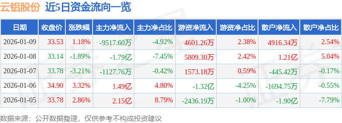 证券之星消息,截至2026年1月9日收盘,云铝股份(000807)报收于33.53元,上涨1.18%,换手率1.65%,成交量57.36万手,成交额19.33亿元。