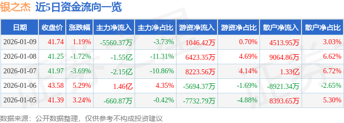 证券之星消息,截至2026年1月9日收盘,银之杰(300085)报收于41.74元,上涨1.19%,换手率5.47%,成交量35.65万手,成交额14.9亿元。