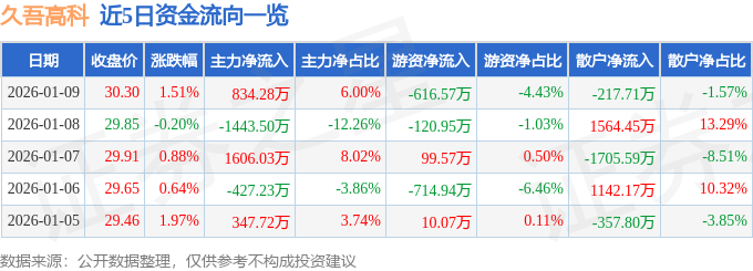1月9日的资金流向数据方面,主力资金净流入834.28万元,占总成交额6.0%,游资资金净流出616.57万元,占总成交额4.43%,散户资金净流出217.71万元,占总成交额1.57%。