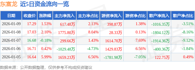 1月9日的资金流向数据方面,主力资金净流入617.48万元,占总成交额2.13%,游资资金净流入398.87万元,占总成交额1.38%,散户资金净流出1016.35万元,占总成交额3.51%。