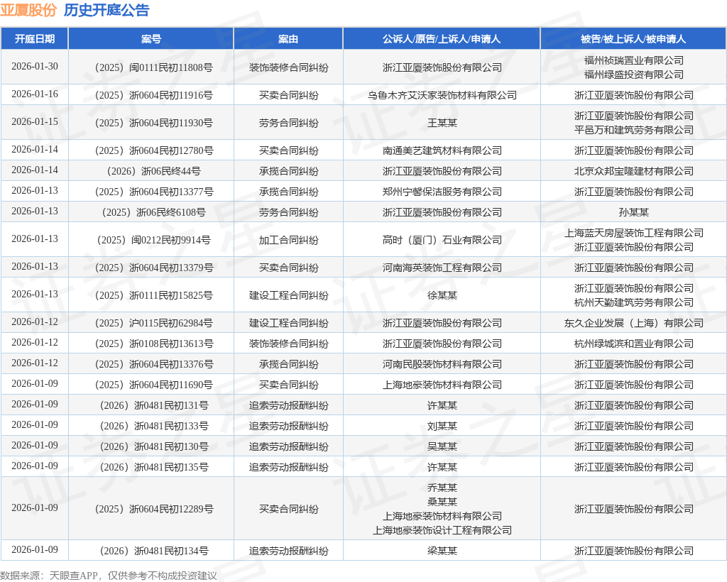 案号:(2025)沪0115民初62984号根据统计,近一年内以浙江亚厦装饰股份有限公司为当事人的历史开庭公告有628则,其中案由为“买卖合同纠纷”的公告以230则居首,其次为“劳务合同纠纷”有116则,“建设工程施工合同纠纷”有55则。历史开庭公告(前20条)如下: