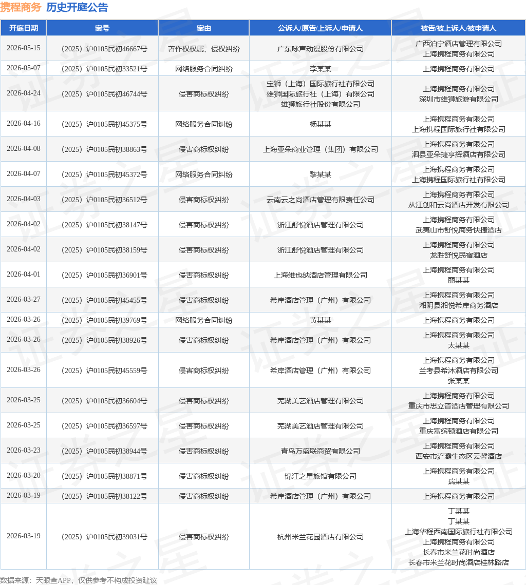 案号:(2025)沪0115民初146620号根据统计,近一年内以上海携程商务有限公司为当事人的历史开庭公告有569则,其中案由为“网络服务合同纠纷”的公告以373则居首,其次为“侵害商标权纠纷”有89则,“服务合同纠纷”有18则。历史开庭公告(前20条)如下: