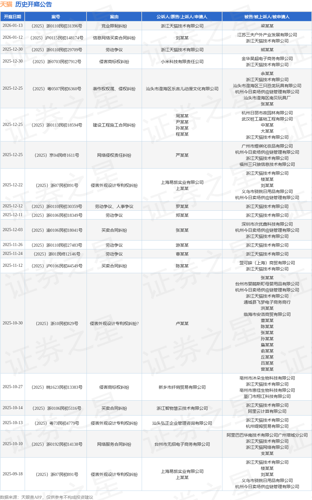 案号:(2025)沪0115民初148174号根据统计,近一年内以浙江天猫技术有限公司为当事人的历史开庭公告有62则,其中案由为“网络服务合同纠纷”的公告以15则居首,其次为“劳动争议”有13则,“买卖合同纠纷”有6则。历史开庭公告(前20条)如下:
