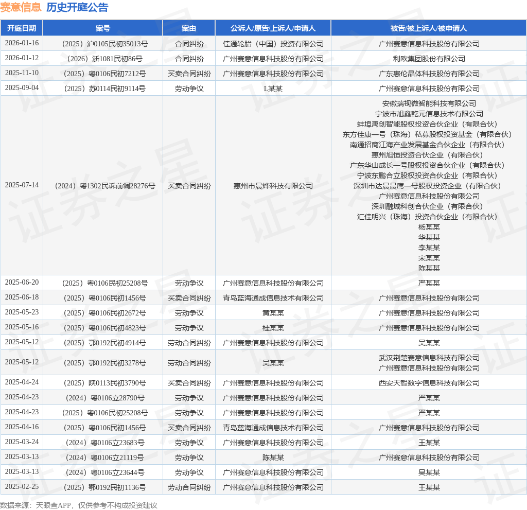 案号:(2026)浙1081民初86号根据统计,近一年内以广州赛意信息科技股份有限公司为当事人的历史开庭公告有19则,其中案由为“劳动争议”的公告以9则居首,其次为“买卖合同纠纷”有5则,“劳动合同纠纷”有3则。历史开庭公告如下: