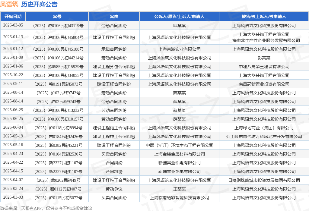 案号:(2025)沪0106民初45188号根据统计,近一年内以上海风语筑文化科技股份有限公司为当事人的历史开庭公告有22则,其中案由为“劳动合同纠纷”的公告以6则居首,其次为“建设工程施工合同纠纷”有5则,“买卖合同纠纷”有3则。历史开庭公告(前20条)如下: