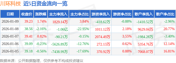 证券之星消息,截至2026年1月9日收盘,川环科技(300547)报收于39.23元,上涨1.74%,换手率6.81%,成交量12.14万手,成交额4.76亿元。