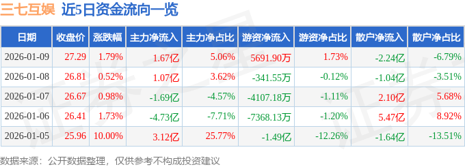 证券之星消息,截至2026年1月9日收盘,三七互娱(002555)报收于27.29元,上涨1.79%,换手率7.65%,成交量122.36万手,成交额32.93亿元。