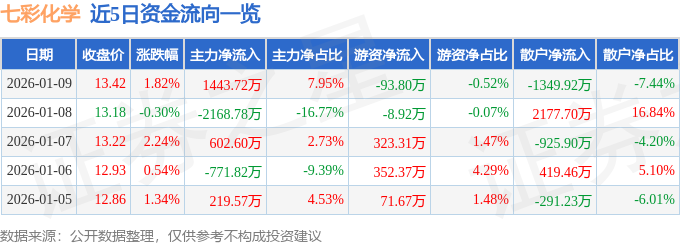 证券之星消息,截至2026年1月9日收盘,七彩化学(300758)报收于13.42元,上涨1.82%,换手率3.72%,成交量13.64万手,成交额1.82亿元。