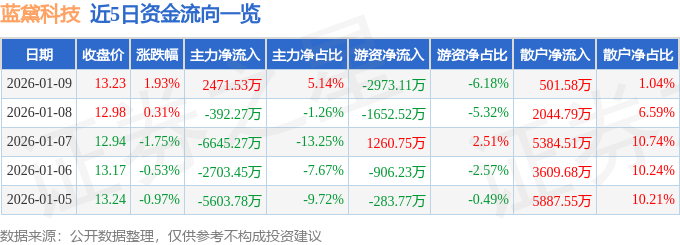1月9日的资金流向数据方面,主力资金净流入2471.53万元,占总成交额5.14%,游资资金净流出2973.11万元,占总成交额6.18%,散户资金净流入501.58万元,占总成交额1.04%。