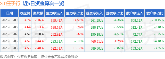 1月9日的资金流向数据方面,主力资金净流入869.41万元,占总成交额14.51%,游资资金净流出261.29万元,占总成交额4.36%,散户资金净流出608.12万元,占总成交额10.15%。
